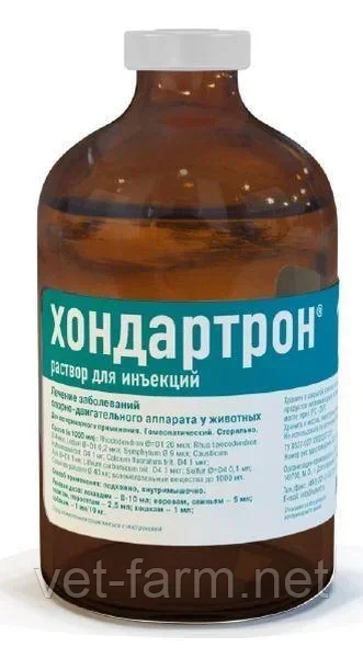 Хондартрон — раствор для инъекций для собак и кошек при заболеваниях опорно-двигательного аппарата. По внешнему виду препарат представляет собой бесцветную прозрачную жидкость.