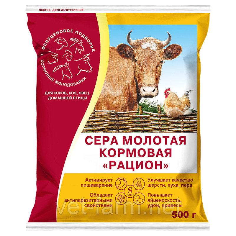 Сера кормовая натуральная высокой очистки используется для коров и молодняка КРС, коз, овец, кошек, собак и птиц как один из основных компонентов кормовых и лечебных смесей: